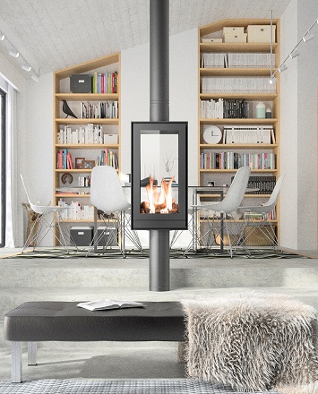 Estufa de Gas THS 15 contemporánea de doble cara, giratoria 360 ° y solo 20 cm de profundidad. Equipada con un vidrio frontal y uno trasero, la estufa THS 15 permite una vista óptima del fuego para disfrutar las llamas desde cualquier posición en la habitación. La cámara de combustión incluye un juego de troncos y brasas en material cerámico, que simula fielmente el efecto de un fuego de leña.